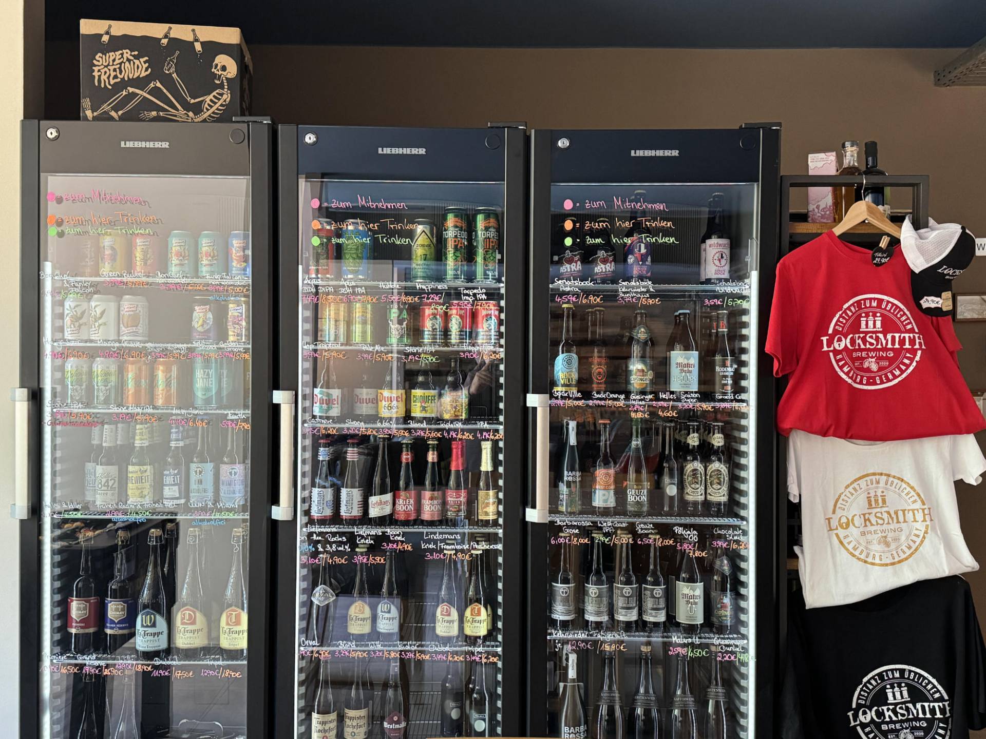 3 Kühlschränke gefüllt mit regionalen, nationalen & internationalen Bieren für zum Direktverzehr oder zum Mitnehmen.
