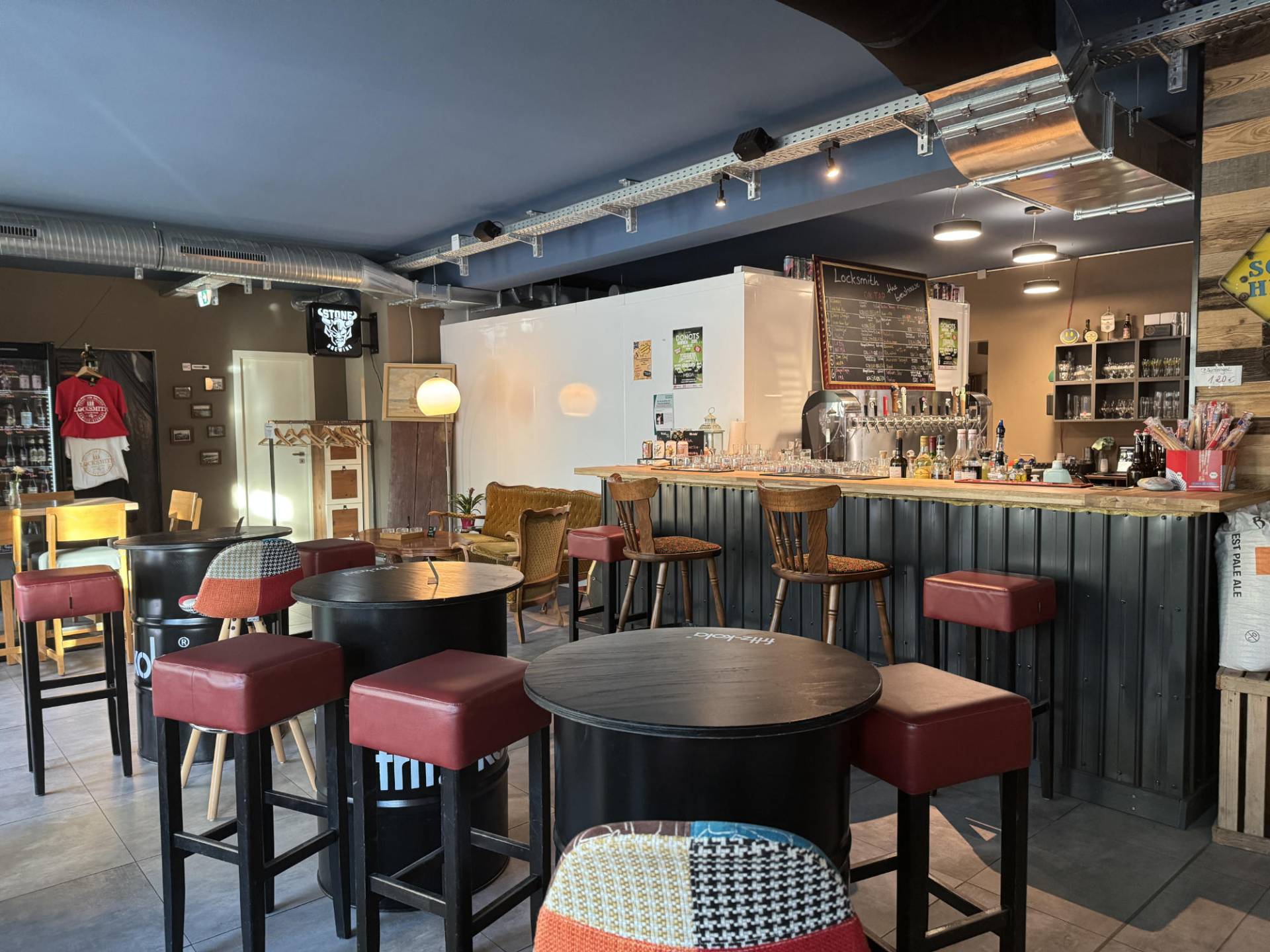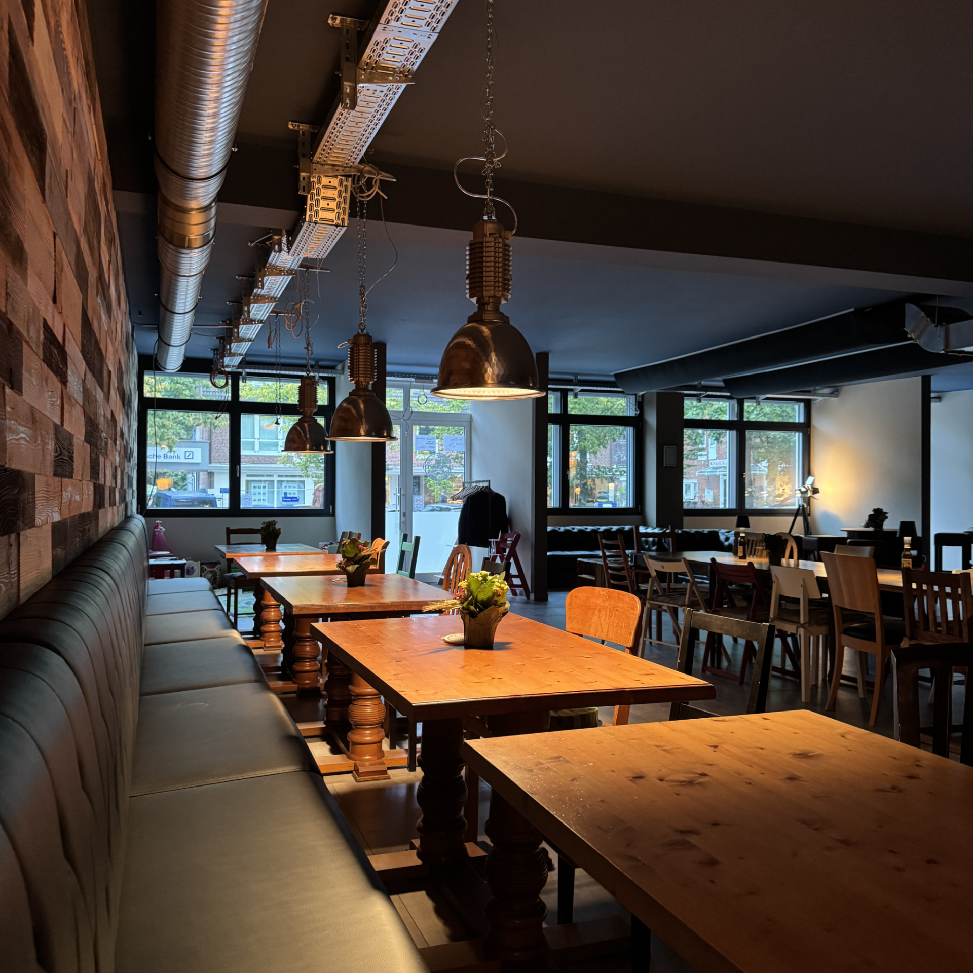 Tische und Bänke im modernen Industrial-Design, ergänzt durch High Tables.
